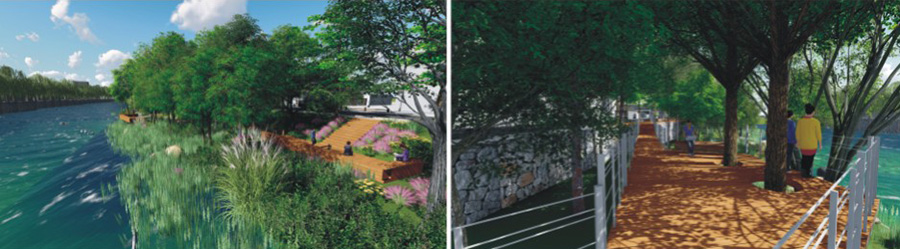 首先,打造生态自然驳岸,恢复河道生态系统与自净能力,重现河道的生命力。依托现有的大片杨树林,设计了一条林间空中步道,进而将城市休闲游憩与河道生态环境的建设相结合,建立连续的慢行网络;改造河堤断面形式,创造更多的亲水空间,充分发挥河道景观做为城市生态基础设施综合的生态系统服务功能;最终提升土地价值,增强城市活力,促进滨河景观与城市宜居环境协同发展。