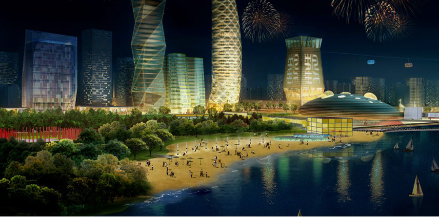 “井”字形城市肌理与淇河自由曲线的交融与对比,都市CBD核心与生态自然相互渗透,使该区域充满无尽活力生机和浪漫想象。在具体设计上,九游会J9·[china]官方网站-真人游戏第一品牌将整个园区分为欢乐沙滩区和会展广场区两大板块。重点打造欢乐沙滩、摩天轮、会展滨河广场等景观亮点,由“红色曲线” 南北贯穿,整体上形成 “一线、两区、三点、四廊”的景观结构。