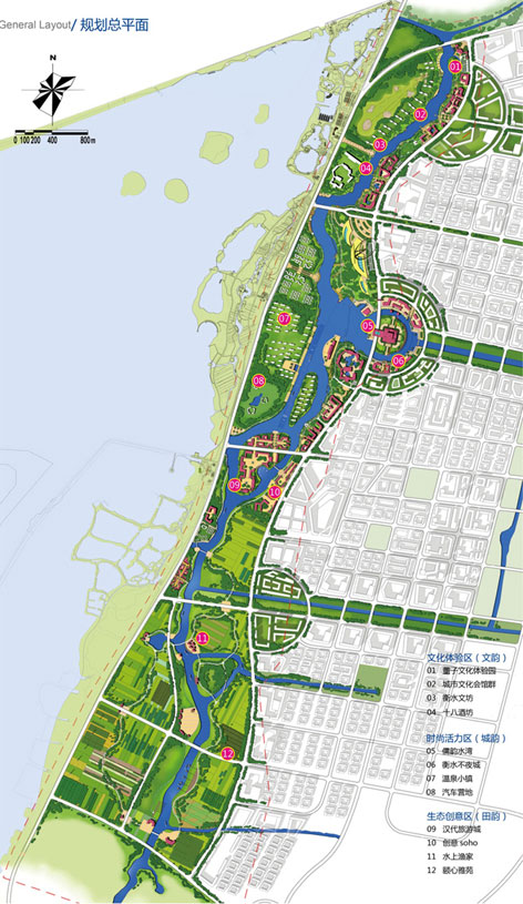 规划整合基地资源,考虑市场需求,注入“董仲舒”这一强势文化品牌,将“董子文化•天人三策”作为项目的主题内涵,全面提升衡水城市文化内涵,形成河道两岸丰富的旅游项目;同时以此为题,规划设计河道重要景观节点,并对周边产业布局提出发展建议。