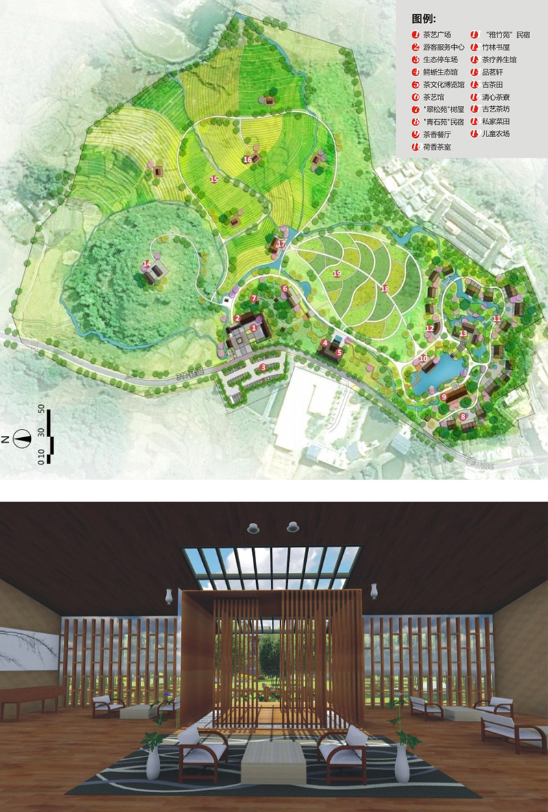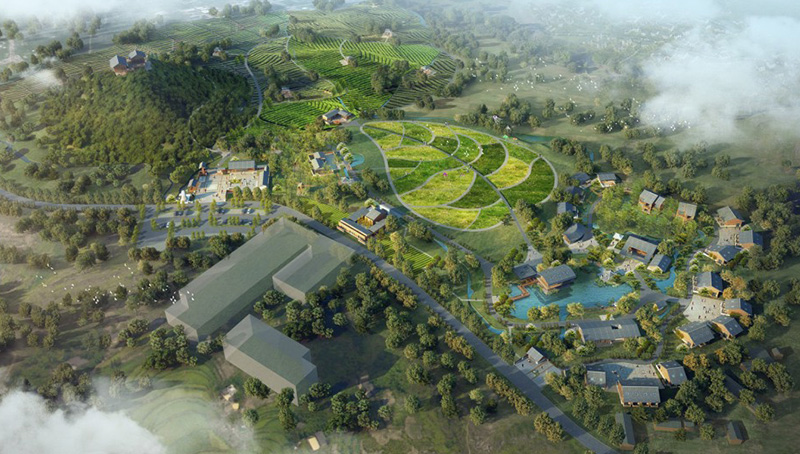 本案依托基地古茶园、山水田园、古祠堂、罗坑水库、滩涂湿地、草原、溶洞等特色景观和优越的生态环境,以广东茶文化为主题,以茶旅产业互助开以为原则,以旅游推动茶产业开发,以茶带动旅游新体验,形成“一心—雪花岩茶厂、一带—雪花岩旅游大道、两区—茶园片区和水库片区”的空间格局,夯实茶业产业基础,引入文化旅游概念,打造主题民宿品牌。同时融入本土客瑶民族风情茶体验,将东方美学与乡村景观有机融合,以“保健强身”、“修德养性”两重理念塑造全新茶养生旅居生活方式,构建一个茶韵飘香、回归乡野、悠然自在的养生旅居目的地,打造罗坑镇生态休闲小镇旅游度假目的地。