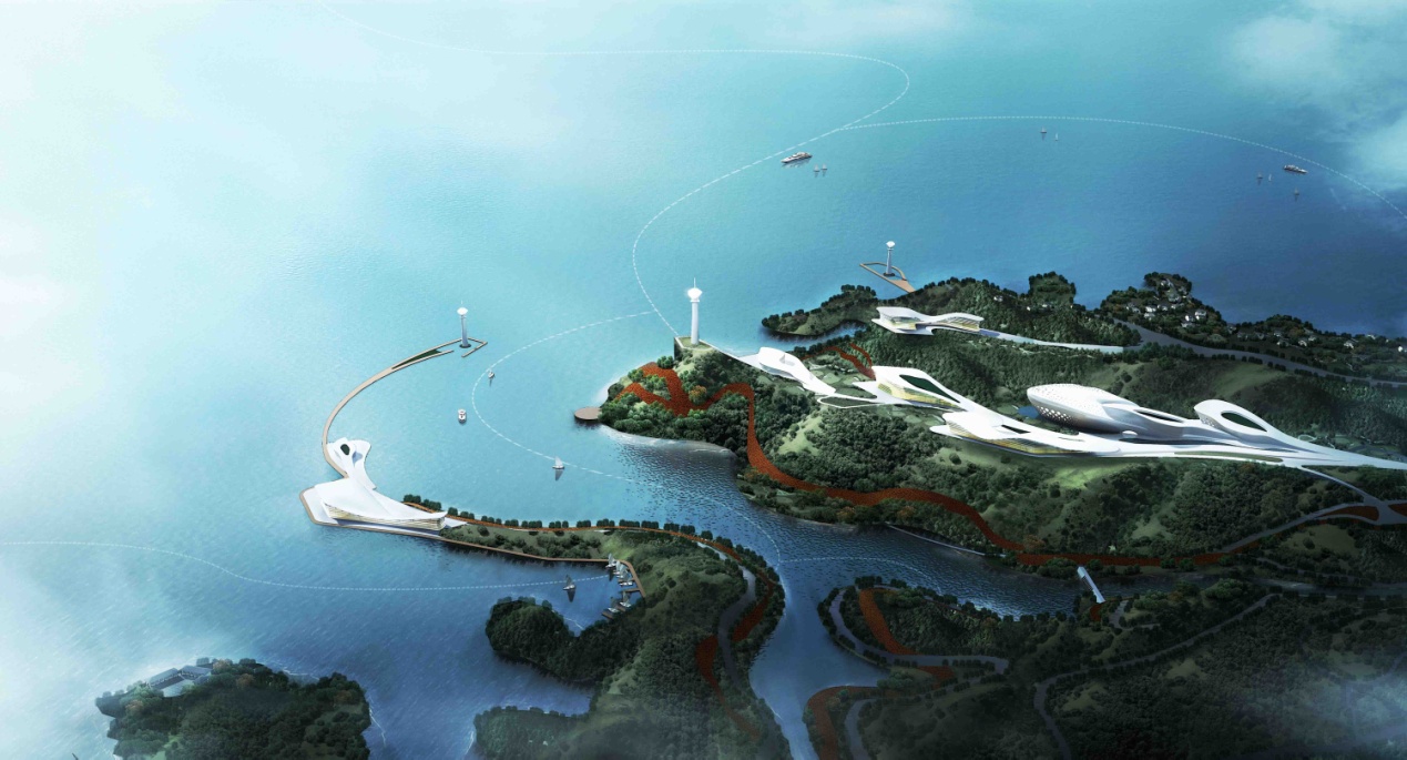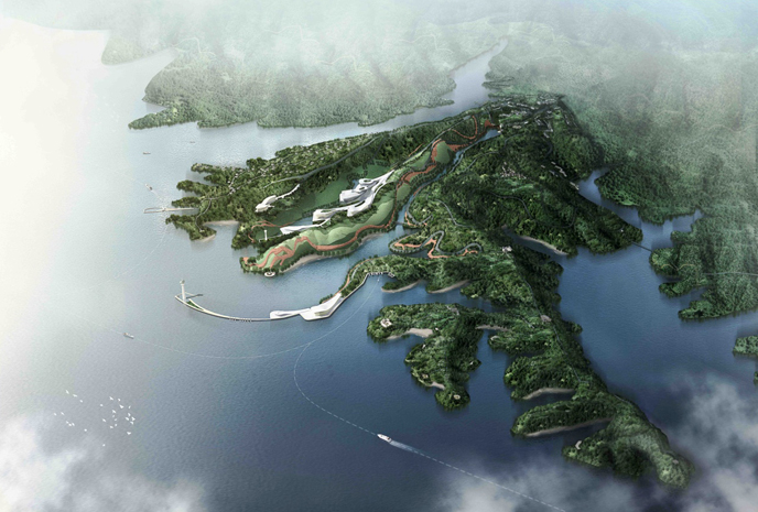 在充分挖掘基地文化的基础上,规划通过对基地自然资源和人文资源的整合,将以“凤”为图腾的楚文化衍生为中国传统文化中的“凤文化”作为主线,总体上形成“一条主线,五大分区”的空间布局,将凤文化的要素“吉祥、音乐、绚丽、爱情、生机”寓意到融入到项目中,依托岛、湖、山等自然资源,打造成以凤文化为特色,集文化体验、生态岛居、浪漫度假、考古科研等功能于一体的生态型文化旅游度假区。