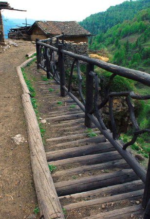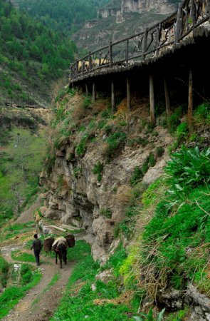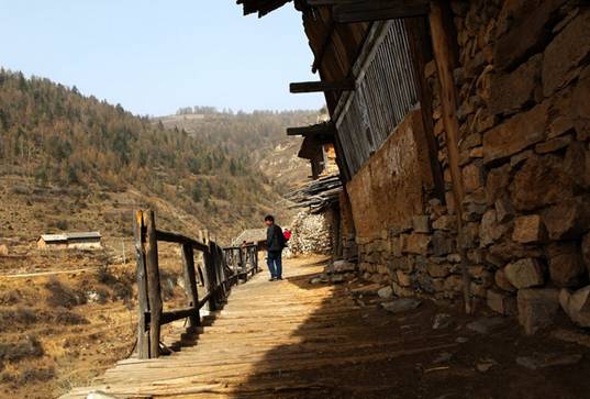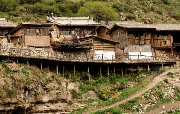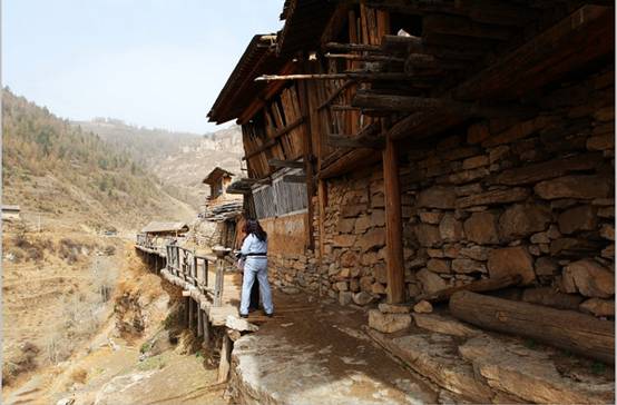 整个村子面向峡谷,房前无院,只有一条走廊。各家走廊之外多用木料横竖组合,悬于空中,铺就木板,这便是村中唯一长约不到1公里的道路,也是连结每户贯穿全村的路。路的里侧是山坡土地,而外侧则是由圆木搭的空中栈桥,下方有立木支撑形成了罕见的“空中栈道”景观。