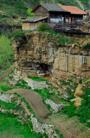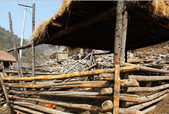 建在悬崖绝壁边上的骡、马、牛、羊、猪圈,虽然不像住人的屋子讲究,但也都经过精心策划,合理布局,这样牲口不至于掉入万丈深渊。
