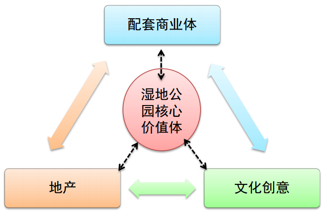 城市湿地公园项目开发,多以文化湿地、休闲湿地、农耕湿地三者结合,树立欢乐湿地的核心品牌,从而带动周边休闲度假配套产品和商业体的开发;在此基础上,建设休闲娱乐和创意产业园,提升湿地的品质和品牌;地产的开发也参与湿地的价值创造,同时,地产项目亦能打造成湿地旅游的吸引物之一。湿地、商业、文化创意和地产,四者之间形成相互促进和发展的良性循环、动态产业链,达到以湿地公园为核心驱动土地利用的最佳效益模式。