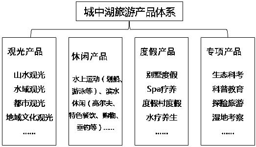 以城中湖的湿地生态为基础,充分挖掘城市文化,融入湖泊旅游开发,构建具有地域特色的城中湖旅游产品体系。总体而言,城中湖可供开发的产品体系包括观光、休闲、度假和湖泊湿地专项旅游产品。