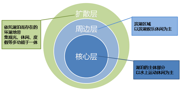 核心层——湖面旅游,以开展水上康乐运动(划船、游艇、帆板等)、湖泊山水观光等旅游活动为主;