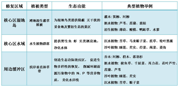 将受损湿地划分为不同类型的修复区域,进行适度的人工干预,在湿地最佳位置重建湿地植物群落,并根据地形、水深、土壤情况和湿地植物本身的生物学特性和生态习性选择不同种类的湿地植物群落。