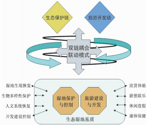 在保护与开发双链耦合联动系统中,湿地生态系统保护链与湿地生态旅游开发链并行发展,相互促进,互为保障。