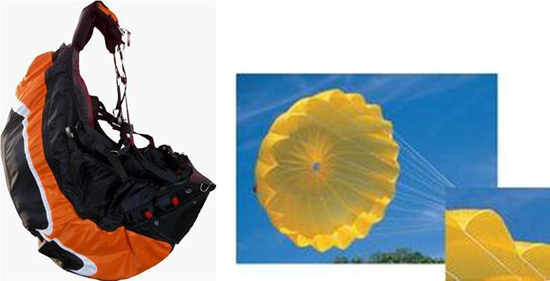 救生伞(Parachute)又称副伞,形状为圆穹形,下沉率大,滑翔比小,主要负责救生。